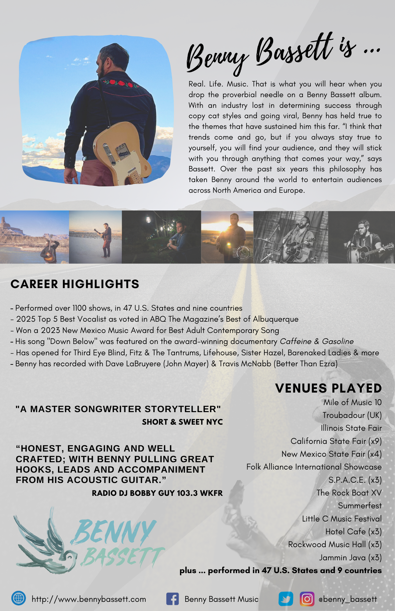 Bassett's musical style can be described as a fusion of alternative rock, folk, and singer-songwriter influences. Through his captivating performances, he creates an intimate atmosphere that allows the focus to be on the profound lyrics and the powerful emotions they evoke. Benny has played over 1,100 shows in seven countries and 47 U.S. States. He has driven over 600,000 miles and is primed for another season of performances across the United States in the Summer of 2025.